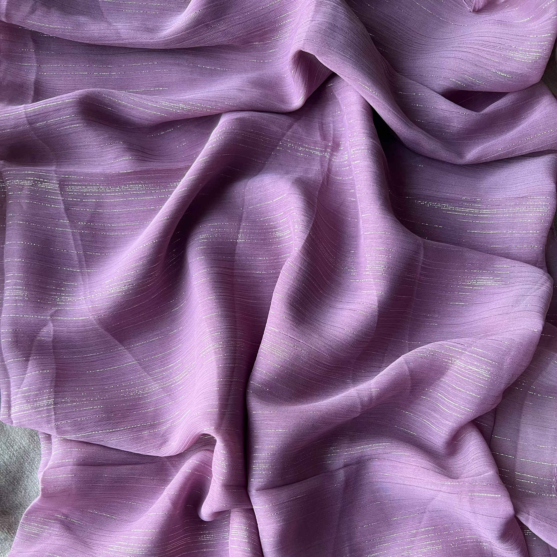 Metallic Chiffon in Lilac radiates soft elegance with a subtle, shimmering finish. Crafted from premium metallic chiffon, it drapes lightly and smoothly, offering a breathable and airy feel. The delicate lilac hue adds a gentle, feminine charm — perfect for festive occasions, evening wear, or creating graceful, standout outfits.