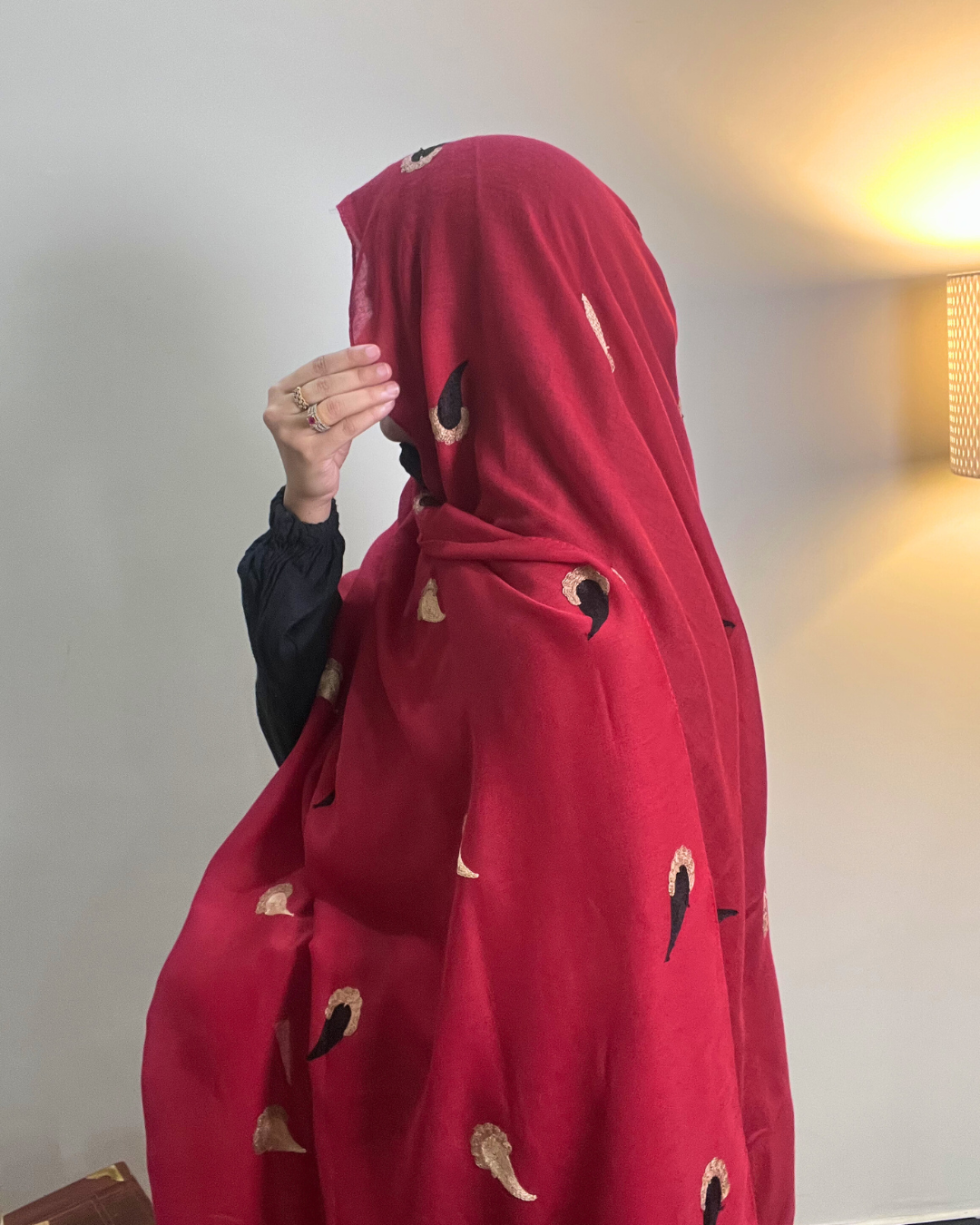 Our Paisley Drop Embroidery Lawn Hijabs are made from the finest, lightweight lawn fabric. The deep, rich crimson red shade brings a bold and striking elegance to your wardrobe, making it a perfect statement piece. These hijabs are adorned with intricate embroidery featuring delicate paisley drop motifs, adding a touch of beauty to the overall look. They can be worn in all seasons and drape effortlessly.