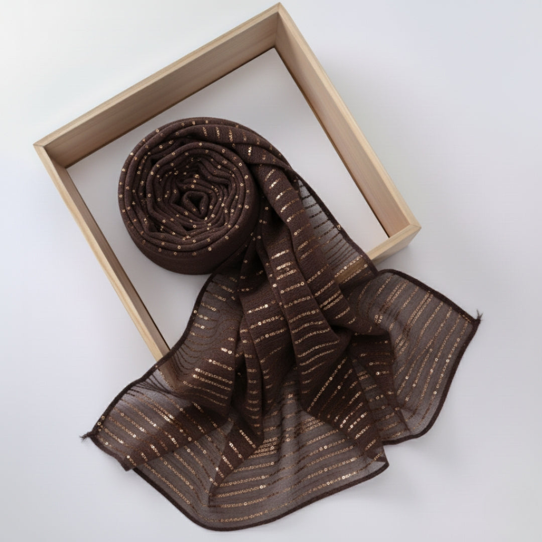 The Dark Brown Sequined Lawn Hijab brings a warm, sophisticated charm to your look. Crafted from premium lawn fabric, it features fine sequins that shimmer subtly, creating an elegant yet understated appearance. The lightweight and breathable material ensures all-day comfort, while the rich dark brown tone adds depth and versatility. Ideal for celebrations or everyday styling, this hijab beautifully combines classic elegance with modern grace.